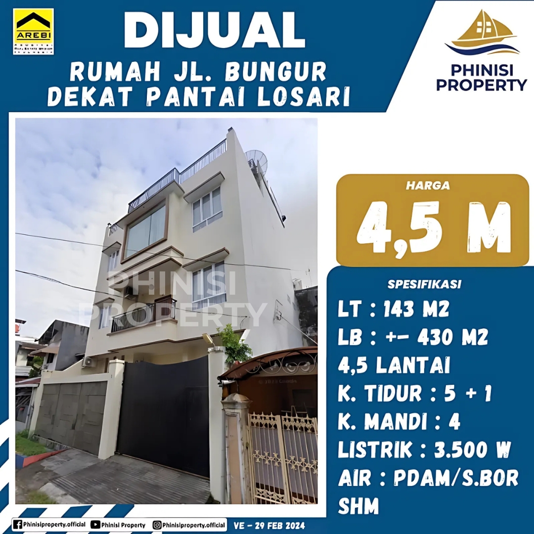 Miliki hunian mewah di Jalan Bungur, Makassar, lokasi idaman yang sangat strategis dan hanya selangkah dari ikon kota, Pantai Losari. Rumah ini berdiri di atas lahan seluas 143 M2 dengan luas bangunan sekitar 430 M2 yang terdiri dari 4,5 lantai, menawarkan ruang yang sangat luas dan nyaman untuk keluarga besar atau sebagai investasi. Dilengkapi dengan 5+1 kamar tidur dan 4 kamar mandi, properti ini menjamin kenyamanan dan privasi penghuninya. Dengan daya listrik 3.500 W dan pasokan air dari PDAM/sumur bor, rumah ini siap memenuhi segala kebutuhan Anda. Ditawarkan dengan harga 4,5 M dan status kepemilikan SHM, rumah di Jl. Bungur ini merupakan pilihan sempurna bagi Anda yang mencari hunian eksklusif dengan nilai investasi tinggi di jantung kota Makassar.