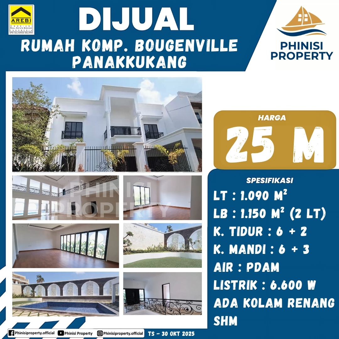 Dijual rumah super mewah dua lantai (2 LT) di Kompleks Bougenville Panakkukang, menawarkan properti premium dengan fasilitas lengkap dan ukuran yang sangat besar. Rumah ini memiliki spesifikasi luas tanah (LT) 1.090 meter persegi dan luas bangunan (LB) 1.150 meter persegi, menjadikannya salah satu hunian terbesar di areanya. Properti ini sangat ideal untuk keluarga besar yang mengutamakan privasi dan kemewahan, dengan total 6+2 kamar tidur dan 6+3 kamar mandi. Fasilitas modern didukung oleh air PDAM, daya listrik sangat besar 6.600 Watt, dan dilengkapi dengan kolam renang pribadi. Status properti ini adalah Sertifikat Hak Milik (SHM), menjamin keamanan investasi properti high-end Anda.