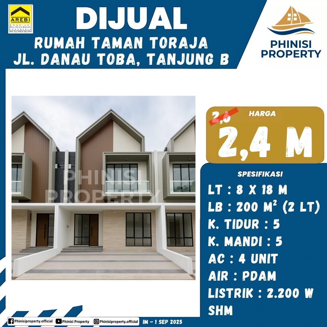 Rumah modern yang berlokasi di Taman Toraja, Jalan Danau Toba, ini sangat cocok untuk keluarga besar. Dengan luas tanah 8 x 18 meter, atau 144 m$^2$, dan luas bangunan 200 m$^2$ yang terdiri dari dua lantai, rumah ini menawarkan ruang yang luas dan fungsional. Terdapat 5 kamar tidur dan 5 kamar mandi. Rumah ini juga sudah dilengkapi dengan 4 unit AC, air PDAM, dan listrik 2.200 watt. Selain itu, sertifikat Hak Milik (SHM) sudah tersedia, memastikan transaksi yang aman dan lancar.