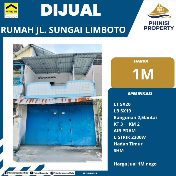 Rumah Murah Jalan Sungai limboto LT 90 LB 180 Tingkat 2,5 lantai KT 3 KM 2 SHM Akses Sungai limboto 2 jalur Tondongkura Gunung Nona Baru Cocok usaha dan hunian