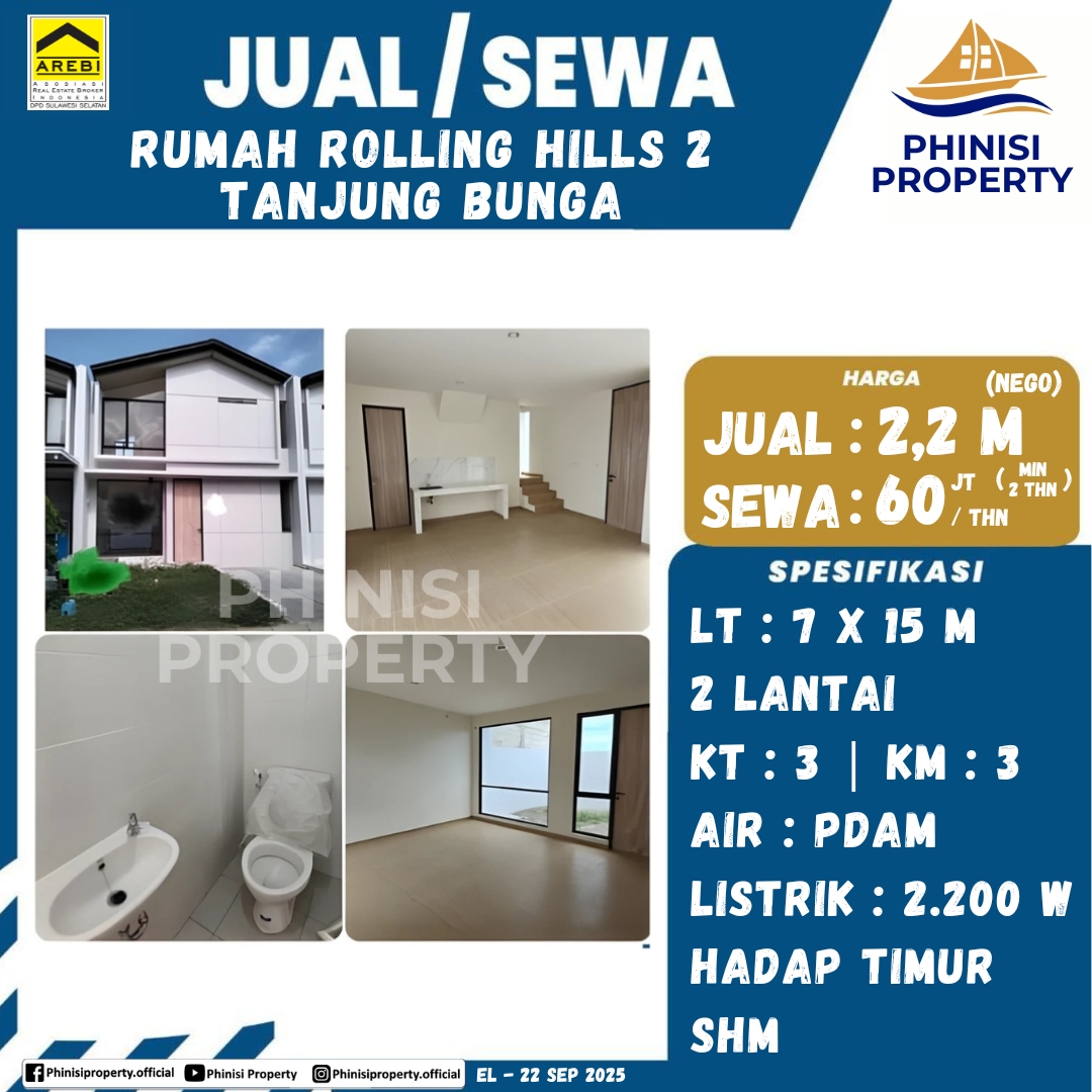 Rumah Rolling Hills 2 LT 105 LB 140 Bangunan 2 lantai KT 3 KM 3 SHM Ada klub house Dekat Trans Mall