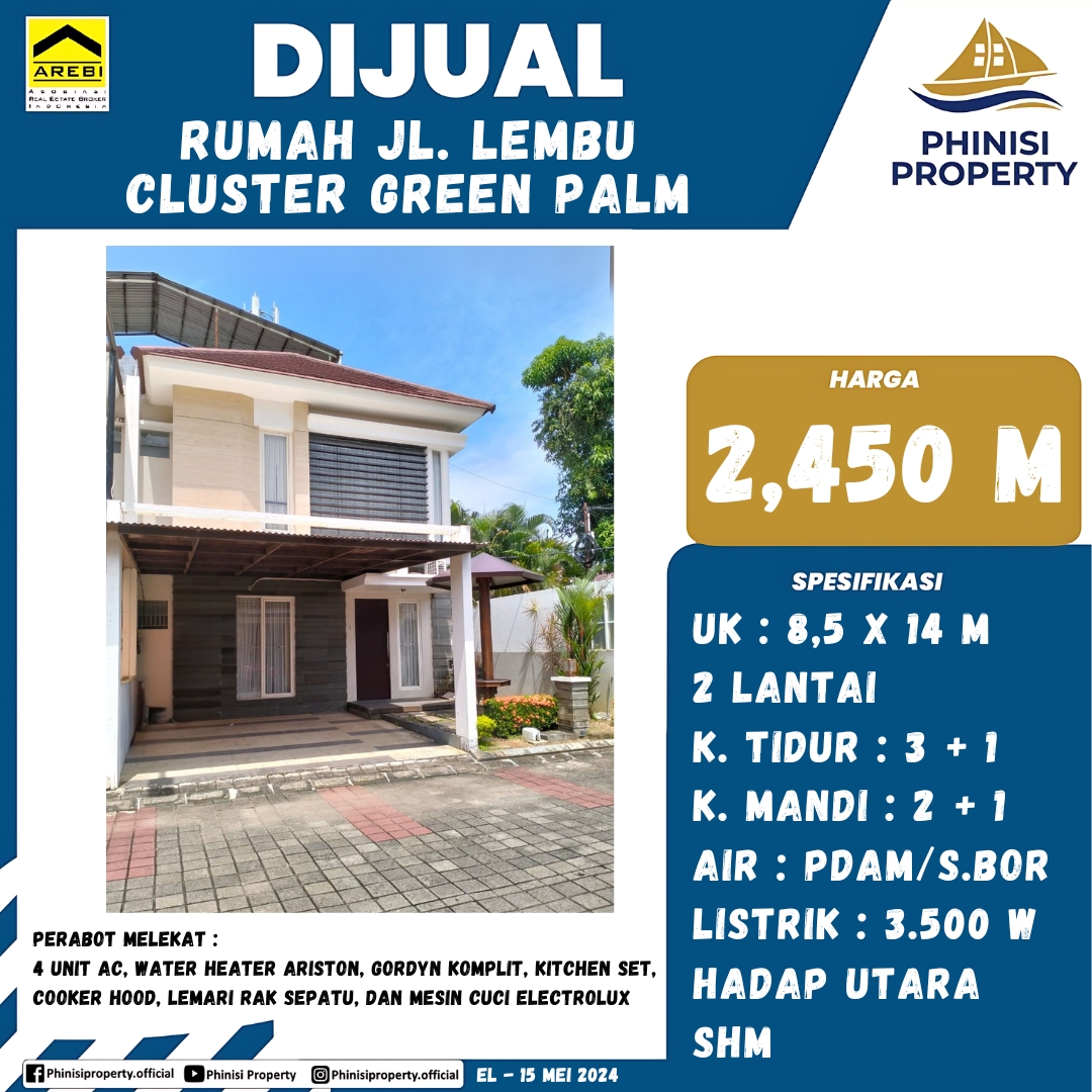 Rumah Tengah Kota Green Palm Dimensi 8,5x14 LT 119 LB 160 Tingkat 2 lantai KT 3+1 KM 2+1 AIR PDAM LISTRIK 3500W Hadap Utara SHM Semi Furnish