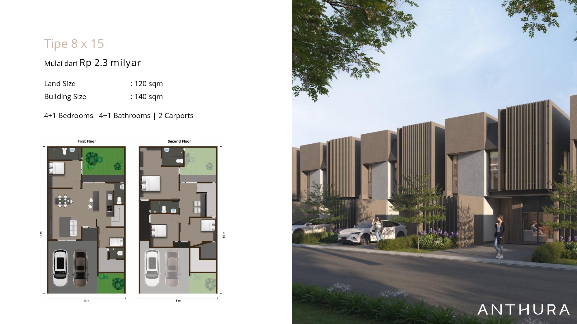 Hunian modern yang mengutamakan kenyamanan dan fungsionalitas, dengan luas bangunan 140 m2 di atas lahan 120 m2, tipe ini dirancang untuk mendukung mobilitas keluarga urban. Tata ruang yang efisien menciptakan keseimbangan antara kebutuhan pribadi dan gaya hidup yang aktif.