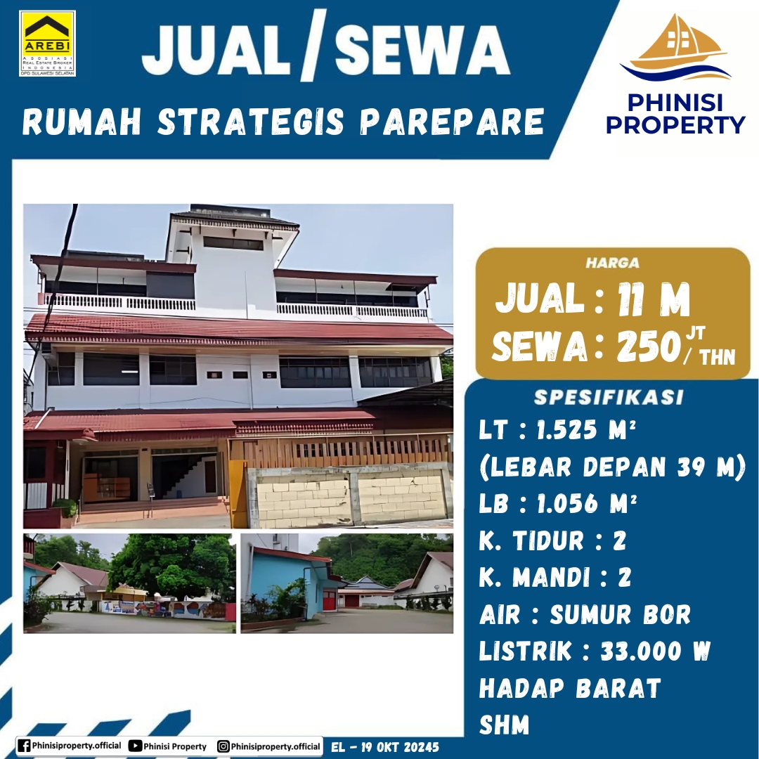 Rumah Usaha Strategis di Pare Pare Berada di poros jalan raya Parkiran Luas LT 1525 Lebar depan 39m LB 1056 Bangunan 3,5 lantai Cocok usaha apa saja