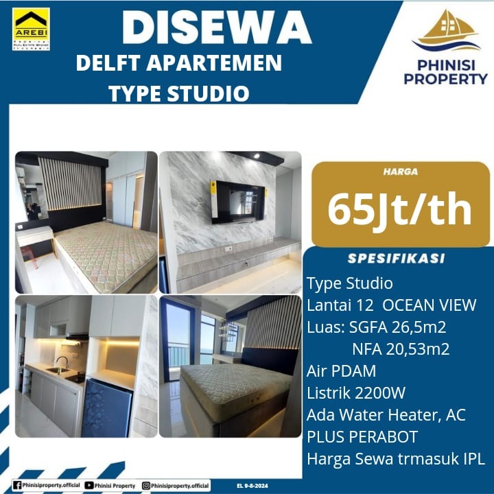 Apartemen tipe studio di Delft ini disewakan, menawarkan hunian yang nyaman dan modern. Berada di lantai 12 dengan pemandangan laut, unit ini memiliki luas 26,5 m² (SGFA) dan 20,53 m² (NFA). Apartemen ini dilengkapi dengan fasilitas air PDAM dan daya listrik 2.200W, serta beberapa perabot termasuk water heater dan AC. Harga sewa sudah termasuk IPL, menjadikannya pilihan yang praktis dan efisien.