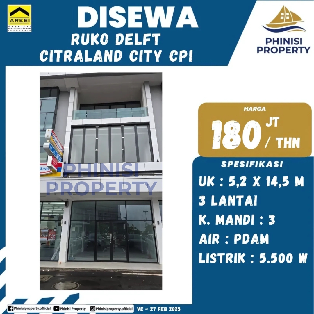 Cari ruko disewakan di kawasan elit Makassar? Ruko Delft di Citraland City CPI adalah pilihan tepat untuk mengembangkan usaha Anda! Dengan ukuran 5,2 meter×14,5 meter dan bangunan 3 lantai, ruko ini menawarkan ruang yang optimal untuk berbagai jenis bisnis, mulai dari retail, kafe, kantor, hingga klinik. Ruko ini dilengkapi dengan 3 kamar mandi, pasokan air PDAM, dan daya listrik 5.500 Watt, memastikan kenyamanan dan kelancaran operasional. Lokasinya yang sangat strategis di Citraland City CPI, salah satu pusat bisnis dan hunian paling modern di Makassar, menjamin eksposur tinggi dan akses mudah bagi pelanggan Anda.
