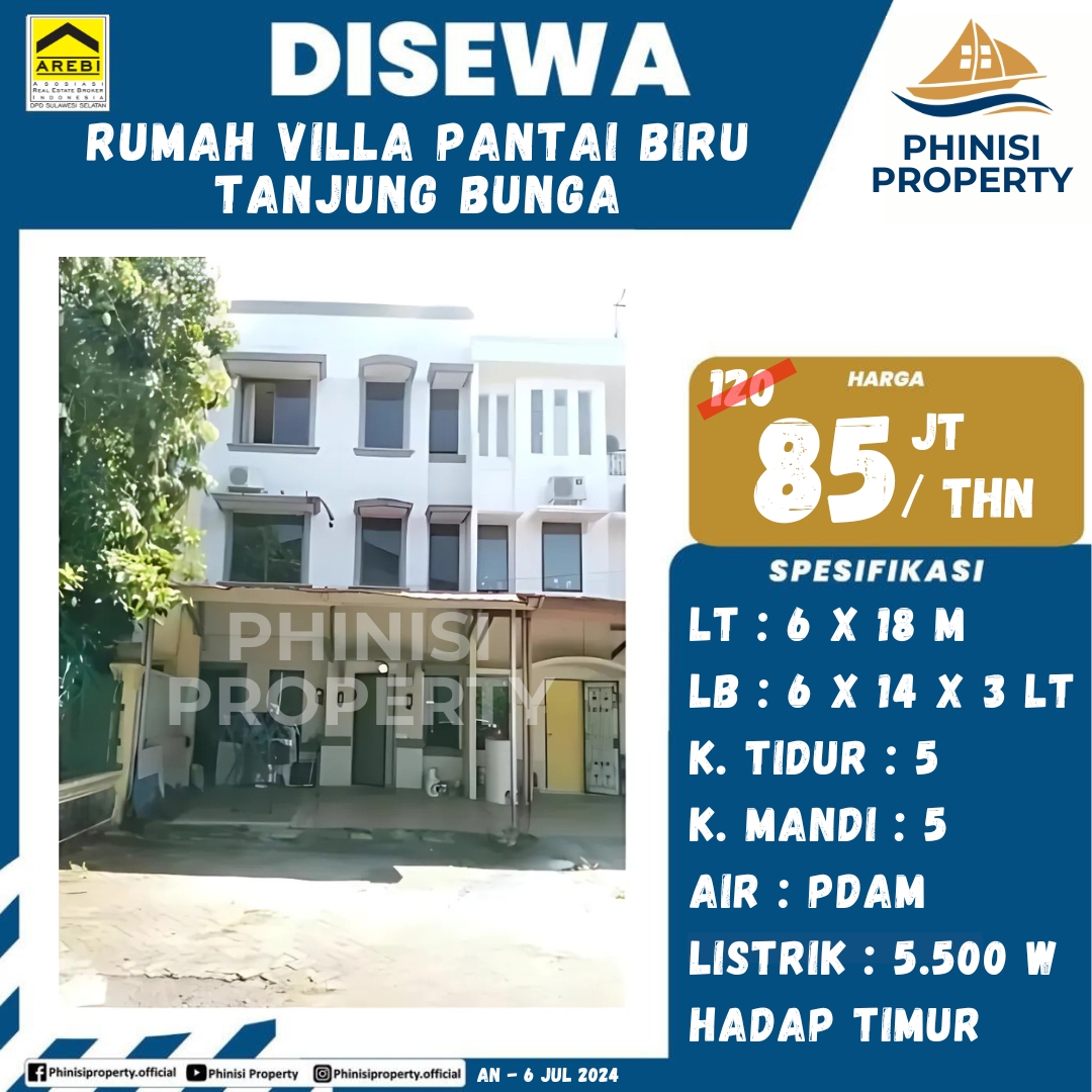 Sewa rumah modern dan mewah dengan rumah di Villa Pantai Biru, Tanjung Bunga. Berlokasi di salah satu area paling eksklusif di Makassar, properti ini menawarkan kenyamanan dan gaya hidup modern. Rumah ini berdiri di atas lahan seluas 6x18 meter persegi, atau 108 meter persegi, dan luas bangunannya 6x14 meter persegi, setara dengan 84 meter persegi. Rumah ini terdiri dari 3 lantai dan memiliki 5 kamar tidur serta 5 kamar mandi, menjadikannya ideal untuk keluarga besar atau digunakan sebagai kantor. Dilengkapi dengan daya listrik 5500 watt dan pasokan air PDAM yang andal, rumah ini siap huni. Menghadap ke arah timur, properti ini mendapatkan pencahayaan alami yang baik di pagi hari. Jangan lewatkan kesempatan untuk menyewa hunian eksklusif ini di lokasi yang sangat strategis.