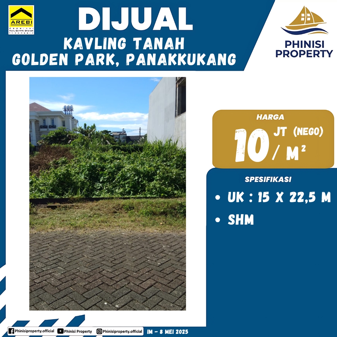 Tanah kavling ini berlokasi strategis di dalam kompleks Golden Park, Panakkukang, salah satu kawasan elit di Makassar. Tanah ini sangat ideal untuk Anda yang ingin membangun rumah impian di lingkungan yang nyaman dan eksklusif. Dengan dimensi 15 x 22,5 meter, tanah ini memiliki luas 337,5 m2. Sertifikat Hak Milik (SHM) sudah tersedia, jadi Anda bisa langsung memulai proses pembangunan. Jangan lewatkan kesempatan untuk berinvestasi di properti yang memiliki nilai jual tinggi ini.